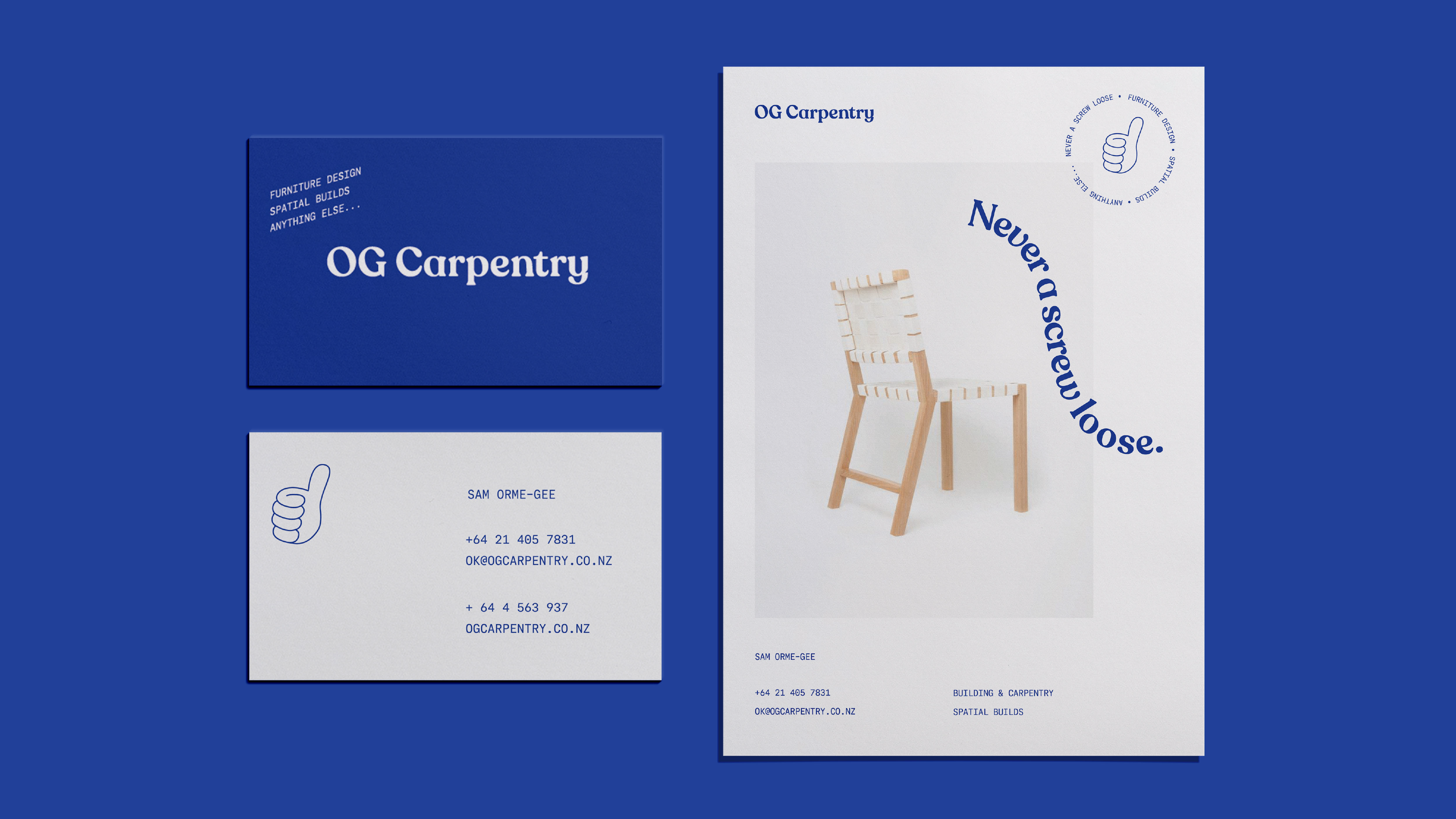 A playful brand identity created for Auckland, New Zealand based furniture and carpentry designer Sam Orme-Gee. He creates beautiful and original boutique furniture pieces for spatial fit-outs and custom one off builds. The sentiment behind the brand 'Never a screw loose' plays off the cheeky nature of the designer with a nod to attention to detail in every piece.